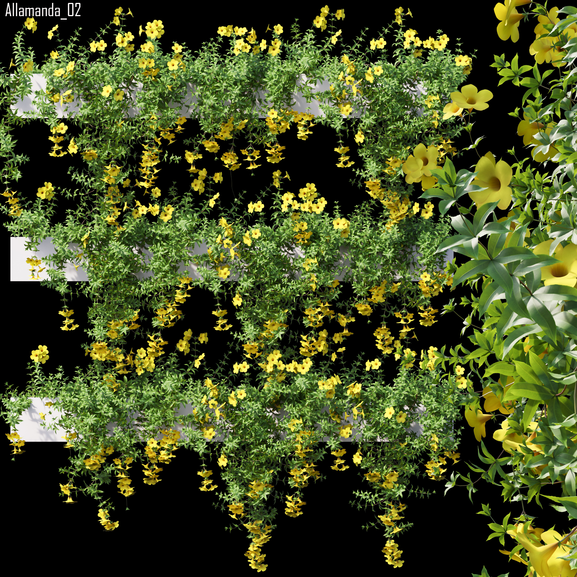 This product Allamanda cathartica – Golden Trumpet 02 of high-quality 3D plant models. Includes many variations in growth, age and form. Therefore, It will allow you to cover all stages of growth making it a complete production solution. You can use it easily with the PBR materials. In addition, we have already set up Vray/Corona Renderer materials for 3Ds Max and GrowFX files. Our FBX format enables you to import into any software you would like to use. For example Sketchup, Lumion, Blender, Cinema 4D….Moreover, GrowFX file you can customize the number of polygons, height and form.