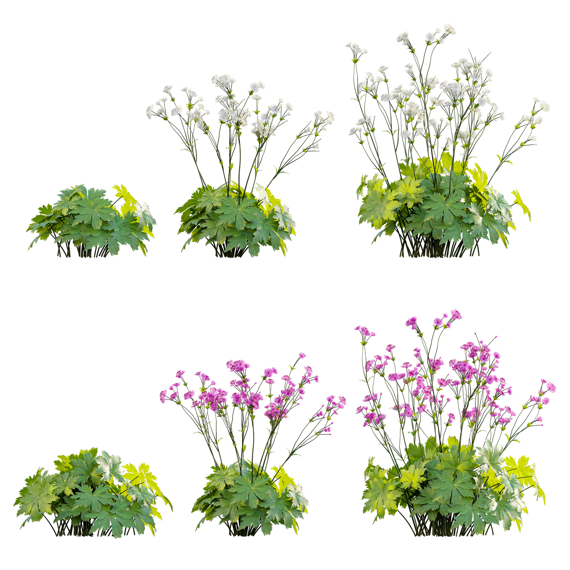 The Astrantia major – Great Masterwort product is a high-quality collection of 3D plants. It includes various variations in growth, age, and shape. This allows you to cover all stages of development, creating a complete production solution. You can easily use it with PBR materials. Additionally, we have pre-set Vray/Corona Renderer materials for 3Ds Max and GrowFX files. Our FBX format allows you to import it into any software you want to use, such as Sketchup, Lumion, Blender, Cinema 4D, and more. Furthermore, the GrowFX file allows you to customize the polygon count, height, and shape.