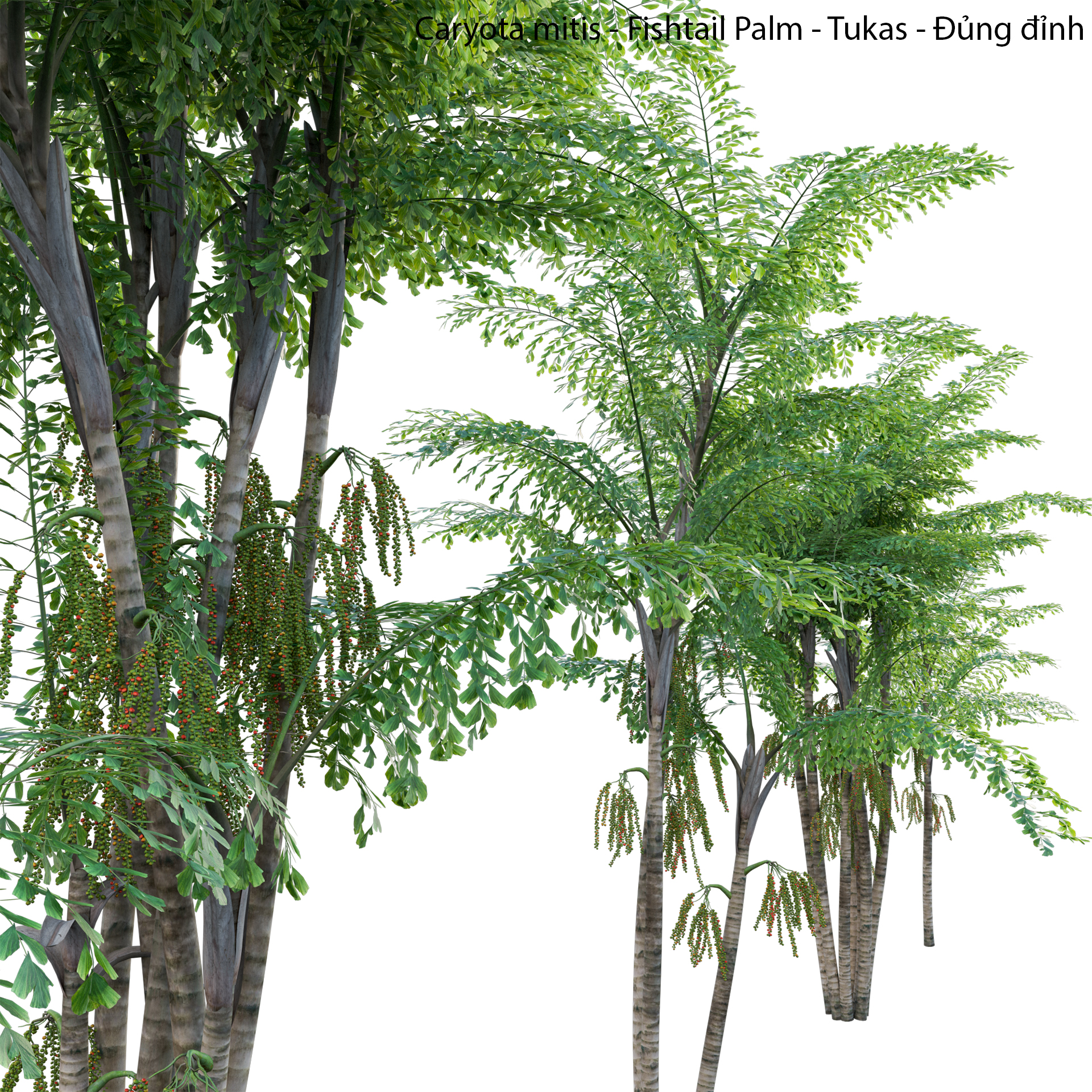 This product Caryota mitis – Fishtail Palm – Tukas of high-quality 3D plant models. Includes many variations in growth, age and form. Therefore, It will allow you to cover all stages of growth making it a complete production solution. You can use it easily with the PBR materials. In addition, we have already set up Vray/Corona Renderer materials for 3Ds Max and GrowFX files. Our FBX format enables you to import into any software you would like to use. For example Sketchup, Lumion, Blender, Cinema 4D….Moreover, GrowFX file you can customize the number of polygons, height and form.