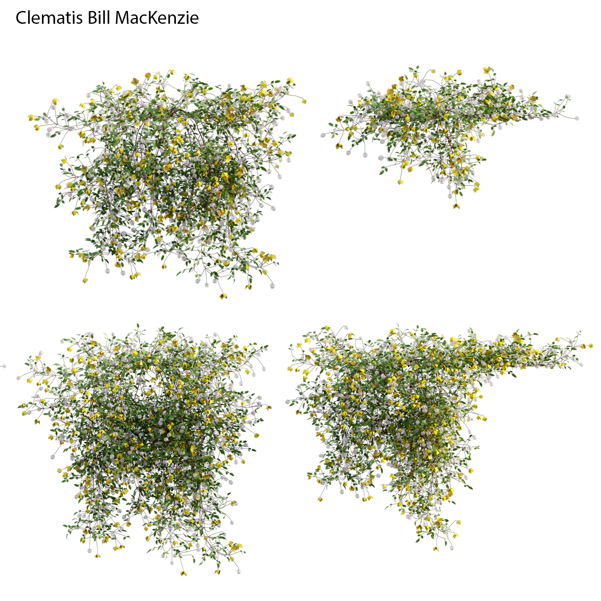 This product Clematis Bill MacKenzie – Clematis tangutica 01 of high-quality 3D plant models. Includes many variations in growth, age and form. Therefore, It will allow you to cover all stages of growth making it a complete production solution. You can use it easily with the PBR materials. In addition, we have already set up Vray/Corona Renderer materials for 3Ds Max and GrowFX files. Our FBX format enables you to import into any software you would like to use. For example Sketchup, Lumion, Blender, Cinema 4D….Moreover, GrowFX file you can customize the number of polygons, height and form.
