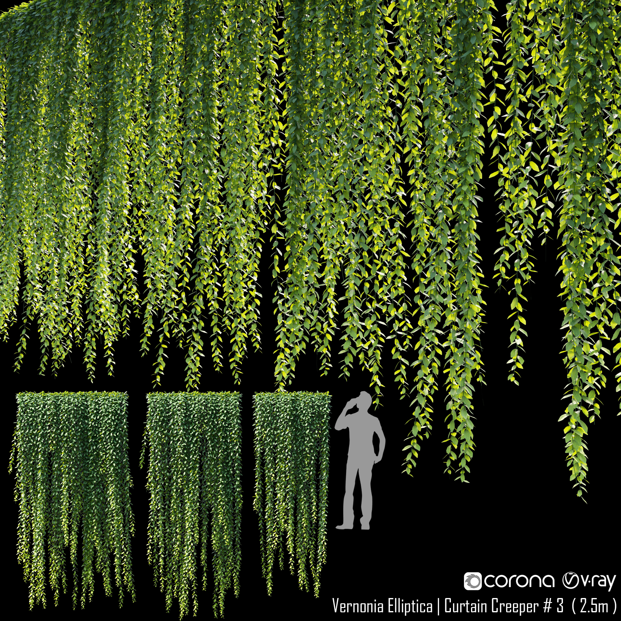 This product Curtain creeper – Vernonia elliptica 01 of high-quality 3D plant models. Includes many variations in growth, age and form. Therefore, It will allow you to cover all stages of growth making it a complete production solution. You can use it easily with the PBR materials. In addition, we have already set up Vray/Corona Renderer materials for 3Ds Max and GrowFX files. Our FBX format enables you to import into any software you would like to use. For example Sketchup, Lumion, Blender, Cinema 4D….Moreover, GrowFX file you can customize the number of polygons, height and form.