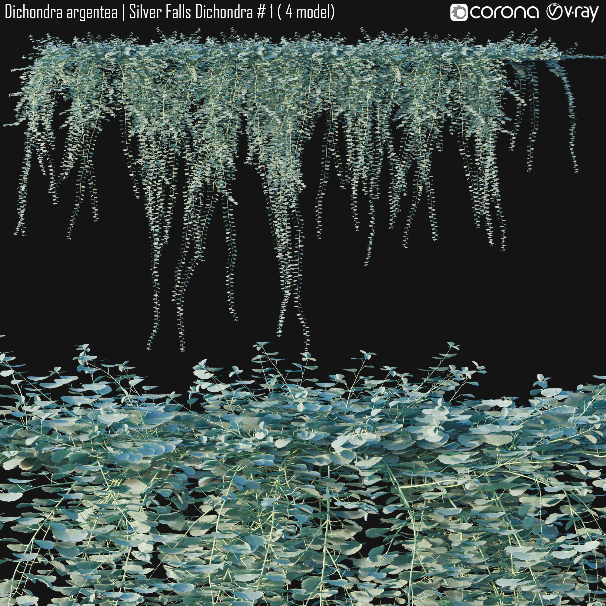 This product Dichondra argentea – Silver Falls Dichondra 01 of high-quality 3D plant models. Includes many variations in growth, age and form. Therefore, It will allow you to cover all stages of growth making it a complete production solution. You can use it easily with the PBR materials. In addition, we have already set up Vray/Corona Renderer materials for 3Ds Max and GrowFX files. Our FBX format enables you to import into any software you would like to use. For example Sketchup, Lumion, Blender, Cinema 4D….Moreover, GrowFX file you can customize the number of polygons, height and form.