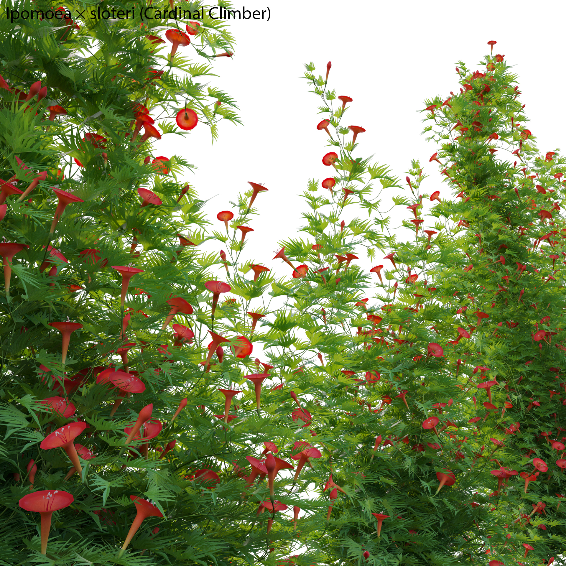 This product Ipomoea sloteri – Cardinal Climber 02 of high-quality 3D plant models. Includes many variations in growth, age and form. Therefore, It will allow you to cover all stages of growth making it a complete production solution. You can use it easily with the PBR materials. In addition, we have already set up Vray/Corona Renderer materials for 3Ds Max and GrowFX files. Our FBX format enables you to import into any software you would like to use. For example Sketchup, Lumion, Blender, Cinema 4D….Moreover, GrowFX file you can customize the number of polygons, height and form.