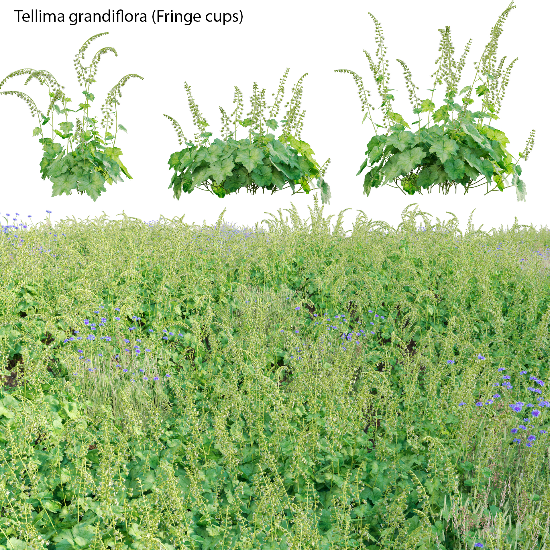 This product Tellima grandiflora – Fringe cups 02 of high-quality 3D plant models. Includes many variations in growth, age and form. Therefore, It will allow you to cover all stages of growth making it a complete production solution. You can use it easily with the PBR materials. In addition, we have already set up Vray/Corona Renderer materials for 3Ds Max and GrowFX files. Our FBX format enables you to import into any software you would like to use. For example Sketchup, Lumion, Blender, Cinema 4D….Moreover, GrowFX file you can customize the number of polygons, height and form.
